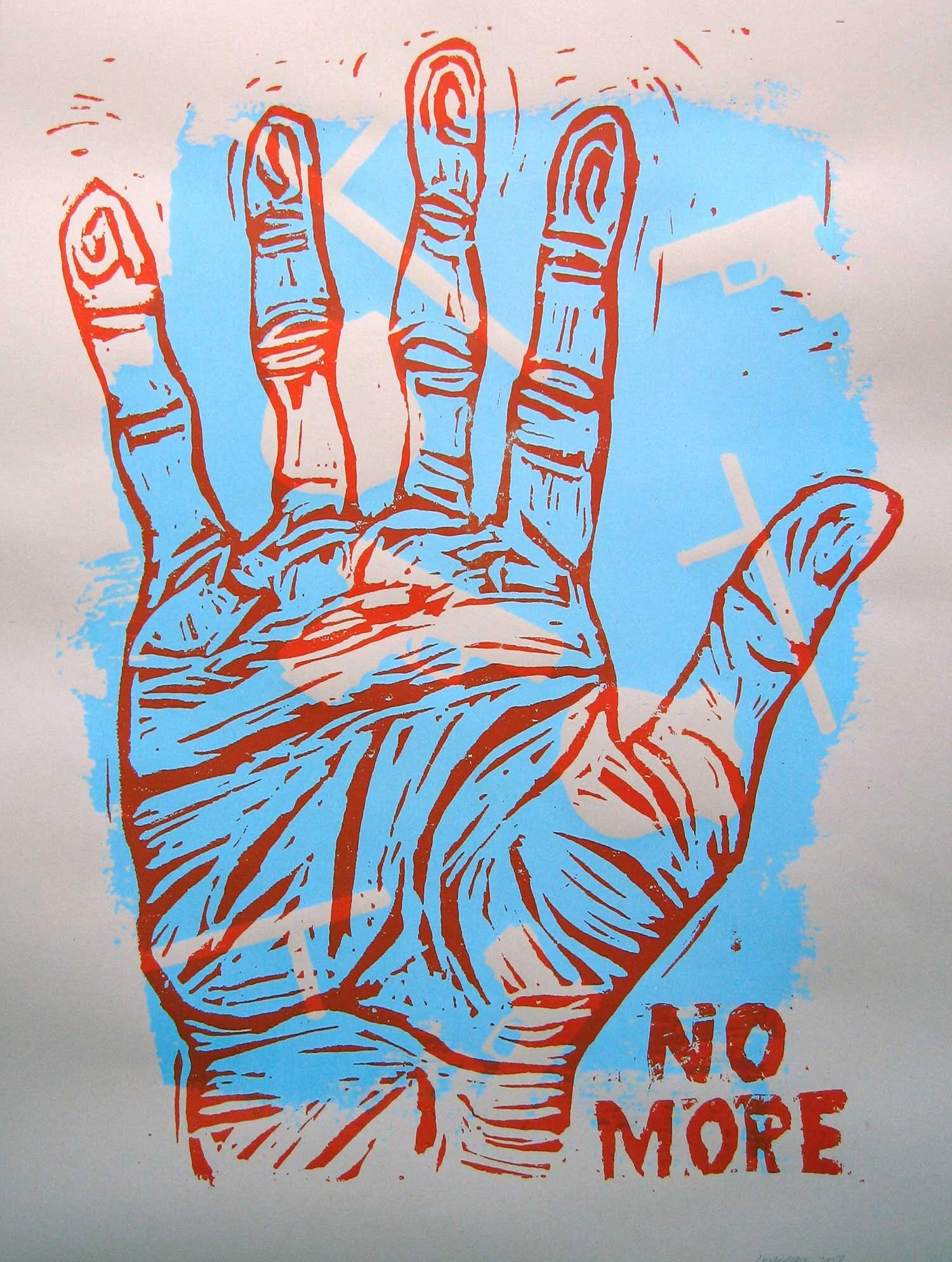 “A police badge is not a license to beat and kill. There is evidence that increases of police violence and weaponry precede increases of violent crime in communities. Based on designs made for Art Against Police Brutality exhibitions in Chicago in 1999 and 2000, printed in 2006. Unfortunately still relevant.”